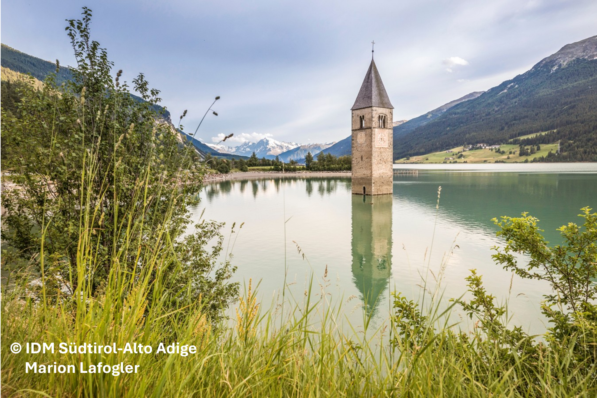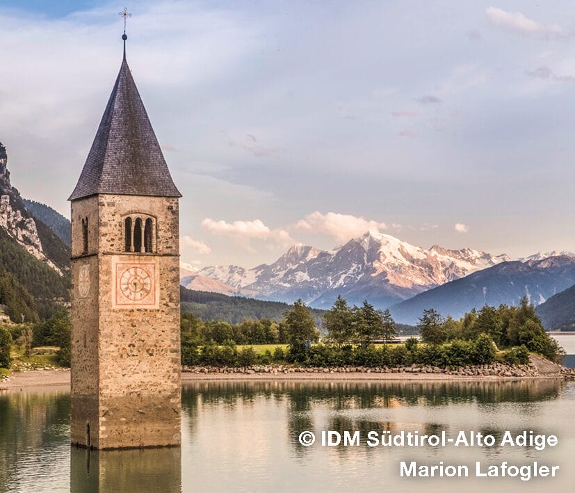 Die Fahrt geht weiter über den Reschenpass: Der Übergang ins Südtirol beeindruckt mit seinem berühmten Kirchturm, der aus dem türkisfarbenen Reschensee ragt. Malerische Dörfer begleiten uns bis nach St. Anton am Arlberg.