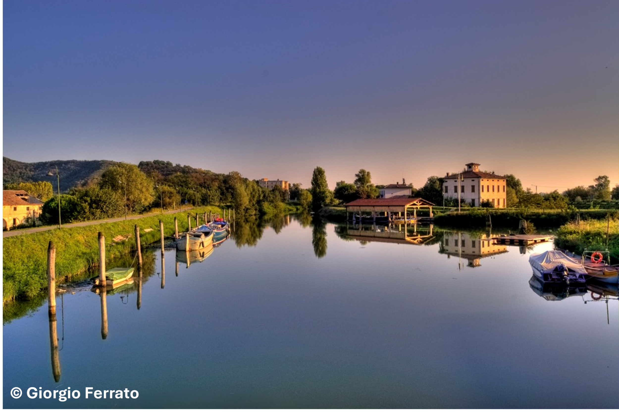 Unsere heutige Tour führt uns zuerst Richtung Osten, hinaus in die sanften Ebenen Venetiens. Schon bald erreichen wir den Fluss Bacchiglione, einen der bedeutendsten Flüsse der Region. Wir folgen den sanft geschwungenen Flussschleifen, vorbei an kleinen Brücken, bis zum Castello di San Martino Della Vaneza. Da verlassen wir den Flusslauf und tauchen tief in das ländliche Venetien ein. Die Strecke verläuft auf ruhigen Nebenstrassen und Fahrradwegen. Ein besonders schöner Moment bietet sich bei Frassanelle, von wo wir einen herrlichen Blick auf die Hügel Monte della Madonna und Monte Grande geniessen können. Ein besonderes kulturelles Highlight ist die Abtei Praglia in Teolo, deren ruhiger Klostergarten und beeindruckende Architektur zu einem kurzen Stopp einladen.
