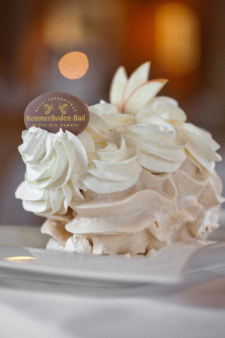 Vor Ort erwartet uns ein besonderer Genuss: ein unglaubliches Merängge-Dessert. Die berühmte luftig-leichte aber dennoch knusprige Merängge des Kemmeribodenbads ist ein Klassiker der Schweizer Konditorkunst und weit über die Region hinaus bekannt.