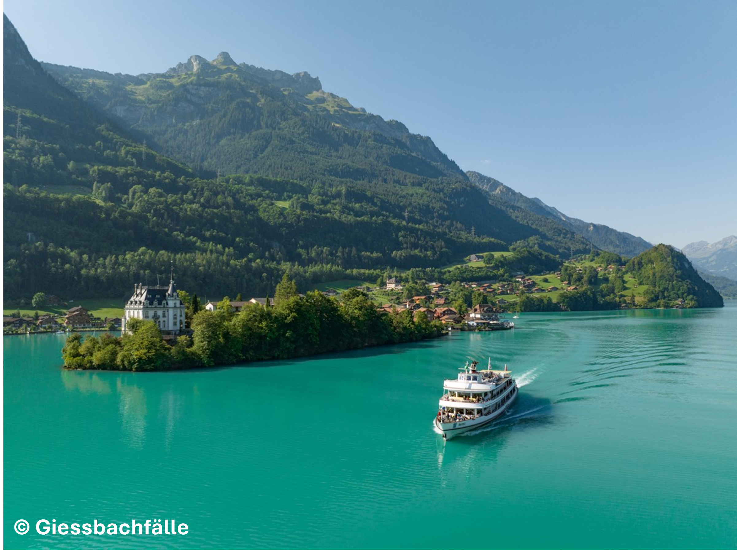 Nach dem Mittagessen bringt uns die Giessbachbahn zurück zur Schiffstation. Von dort setzen wir unsere Reise fort und fahren mit dem Schiff weiter nach Interlaken, wo wir noch einmal die herrliche Aussicht auf See und Berge geniessen, bevor wir die Heimfahrt antreten.