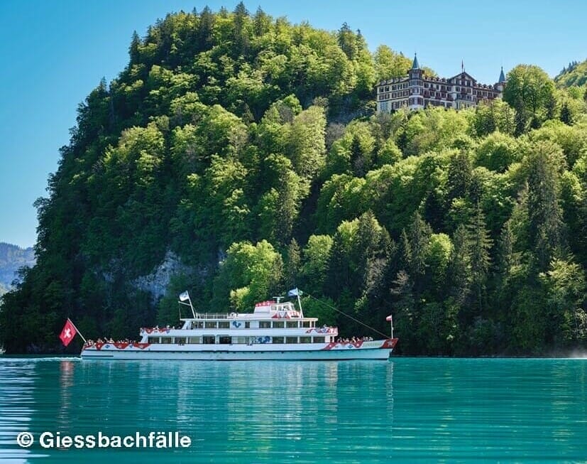 In Brienz angekommen, wechseln wir aufs Schiff. Während wir über den smaragdgrünen Brienzersee gleiten, erleben wir die ruhige, frühlingshafte Stimmung des Ostermontags und die eindrucksvolle Naturkulisse rund um den See. Bei der Giessbach-Station steigen wir aus und fahren mit der historischen Giessbachbahn, der ältesten Standseilbahn Europas, hinauf zum Grandhotel.