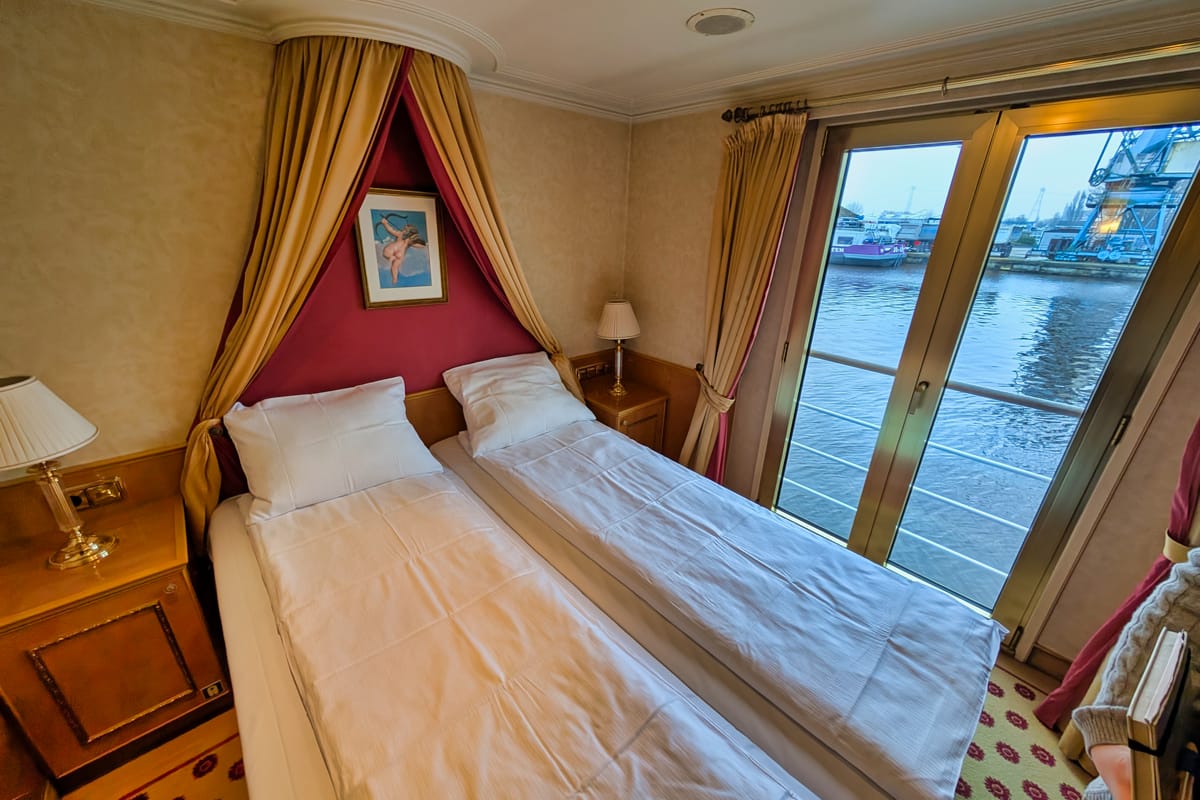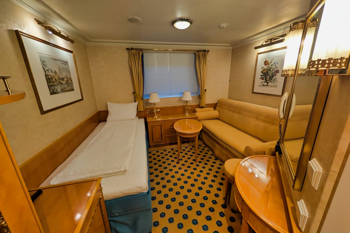 Das Schiff hat insgesamt 48 ca. 12 m2 grosse Kabinen. Sie sind freundlich und komfortabel eingerichtet mit Dusche/WC, Föhn, Bordtelefon, TV, Safe, Minibar und Klimaanlage. Alle Kabinen auf beiden Decks verfügen über ein grosses Panoramafenster, die auf dem Hauptdeck nicht zu öffnen sind.