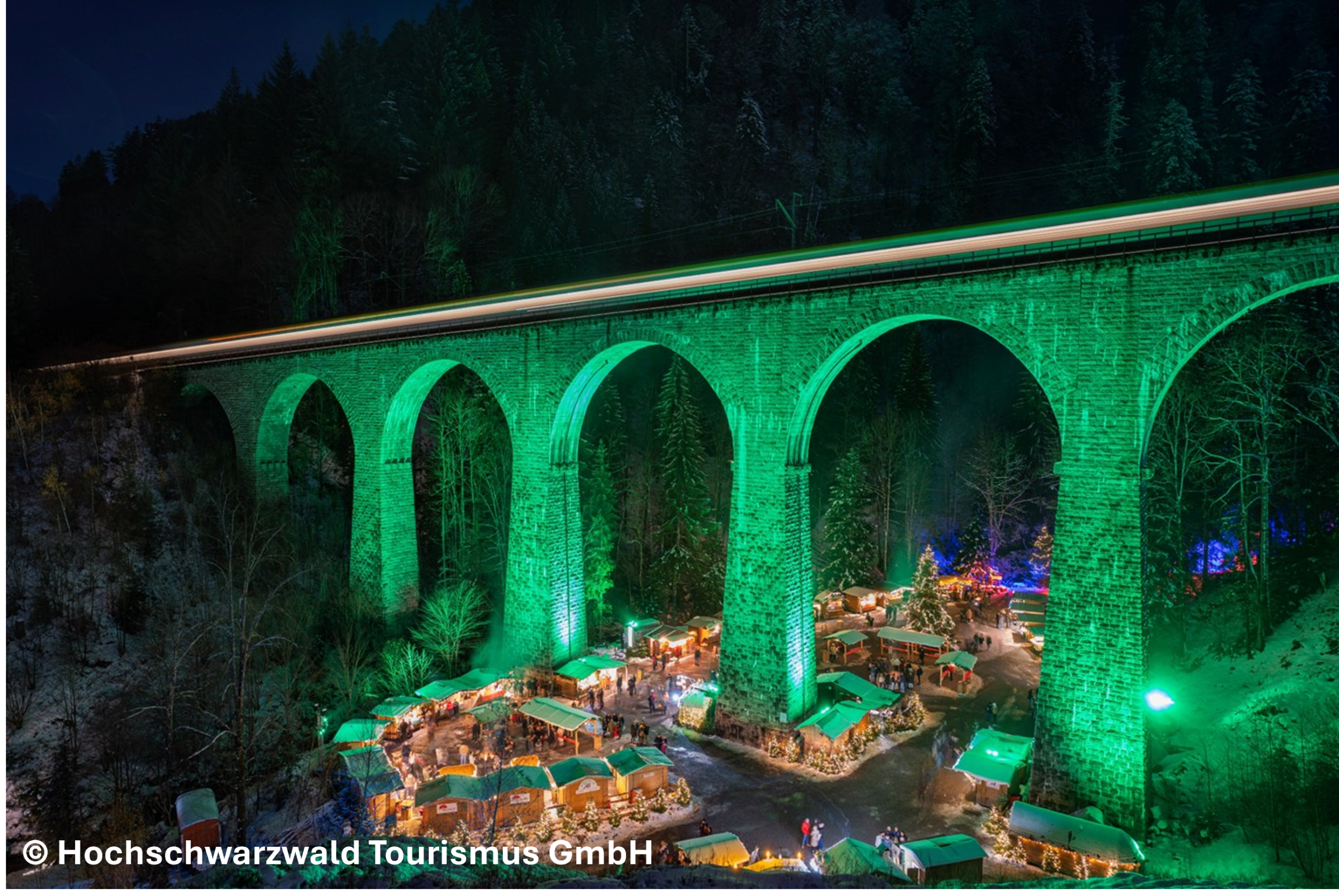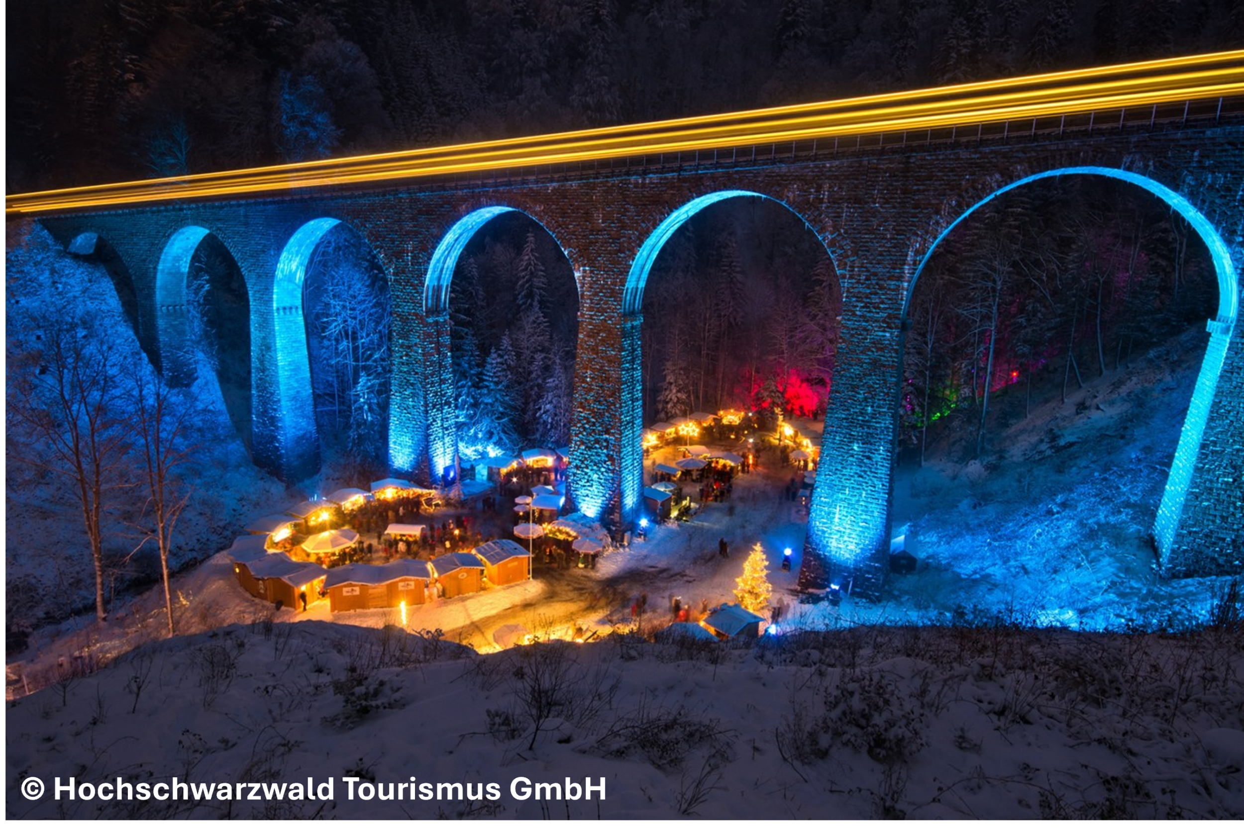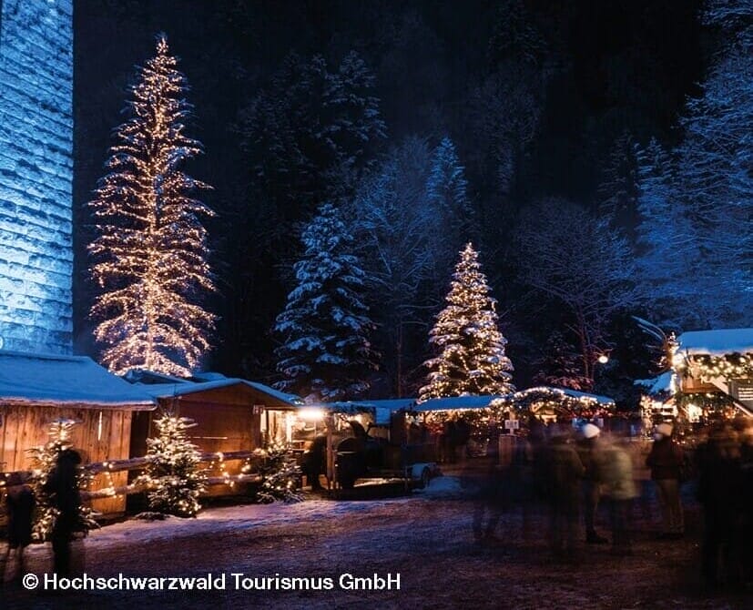 Später geht die Reise weiter durch den Schwarzwald in Richtung Norden in die Ravennaschlucht. Der aussergewöhnliche Weihnachtsmarkt in der tiefen Ravennaschlucht, unterhalb des imposanten Ravenna-Viadukt, müssen Sie gesehen haben. Durch die mächtige Eisenbahnbrücke, die mit festlichen Lichtern kunstvoll in Szene gesetzt wird und der atemberaubenden Natur, wird eine einmalige Weihnachtsatmosphäre geschaffen.