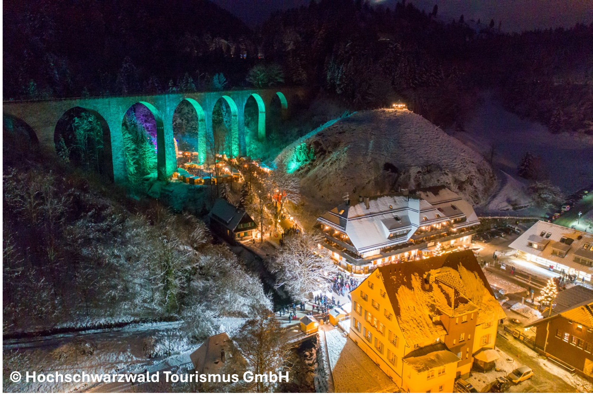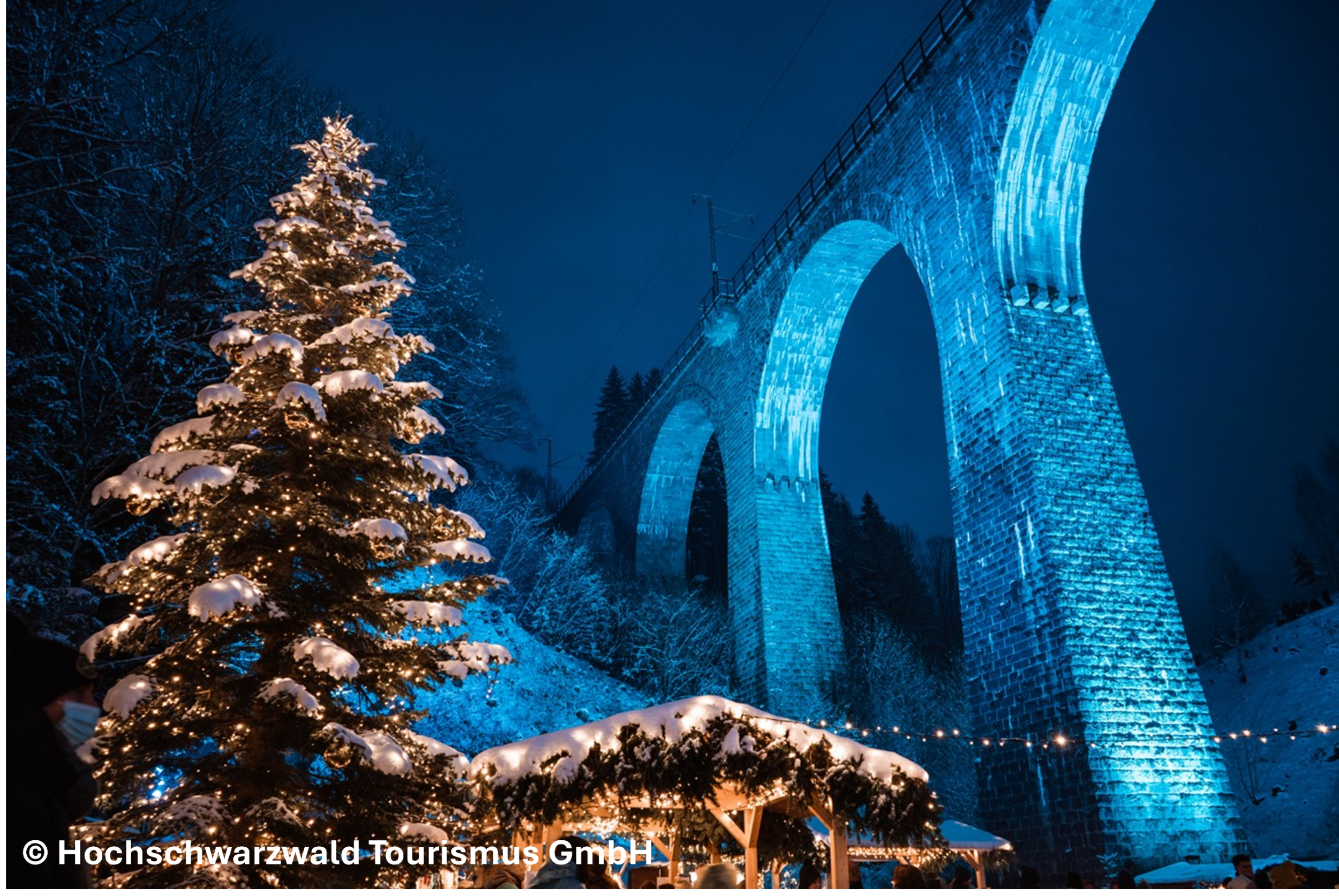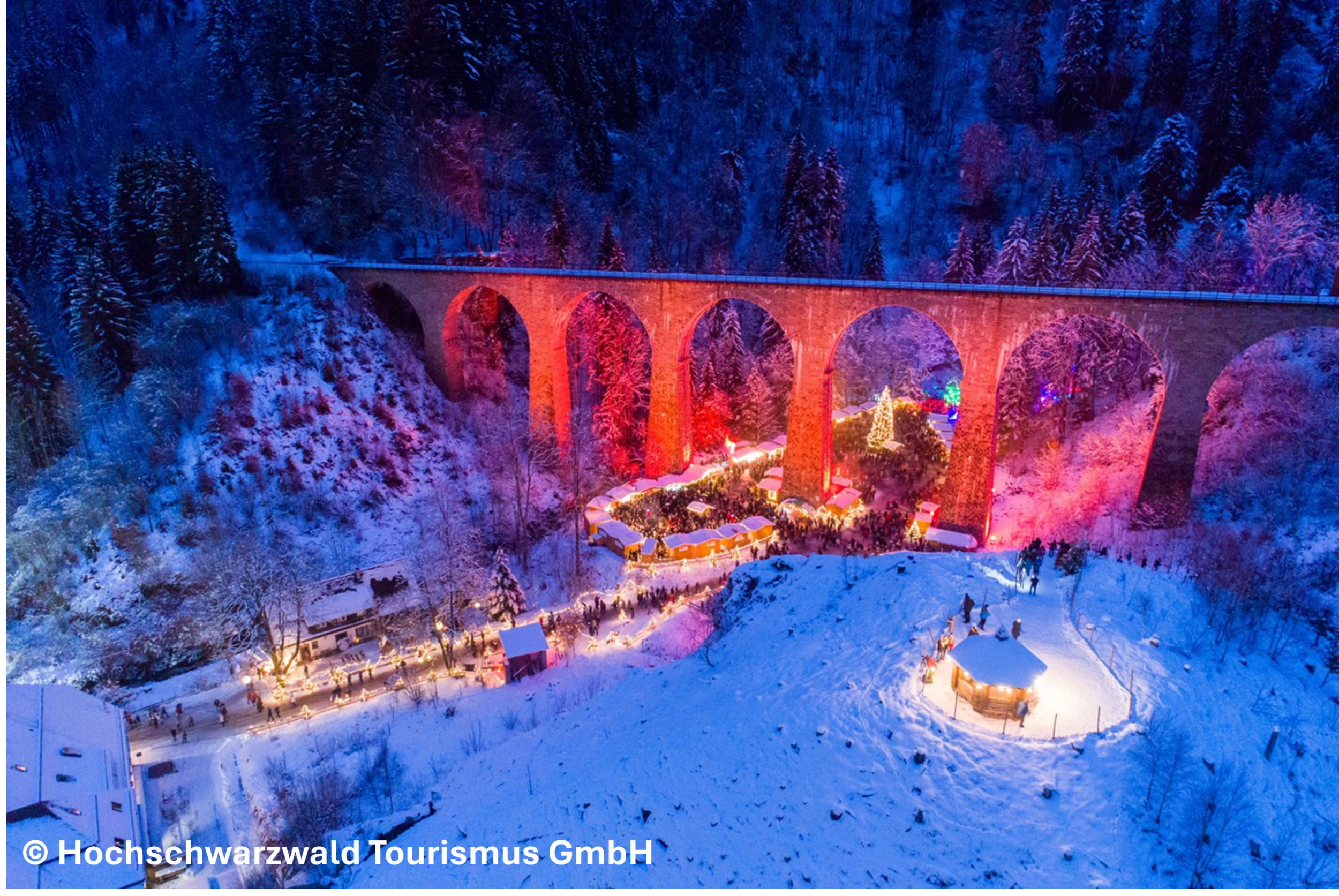Später geht die Reise weiter durch den Schwarzwald in Richtung Norden in die Ravennaschlucht. Der aussergewöhnliche Weihnachtsmarkt in der tiefen Ravennaschlucht, unterhalb des imposanten Ravenna-Viadukt, müssen Sie gesehen haben. Durch die mächtige Eisenbahnbrücke, die mit festlichen Lichtern kunstvoll in Szene gesetzt wird und der atemberaubenden Natur, wird eine einmalige Weihnachtsatmosphäre geschaffen.